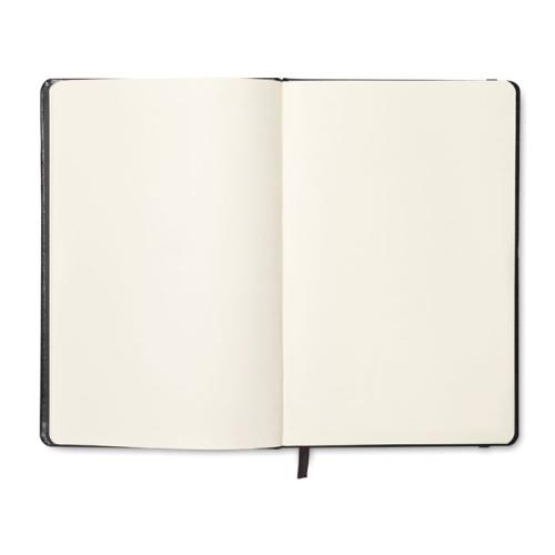A5 notebook with hard PU cover. Casebound. 192 plain recycled paper pages (96 sheets). Matching elastic closure strap and ribbon page-marker. FSC®-certified | FSC MIX CREDIT, P7.1, FSC-C213206