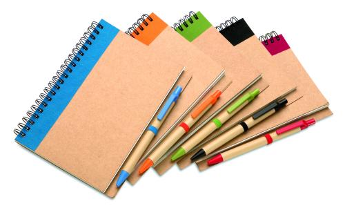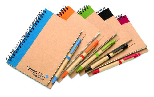Recycled paper notebook with matching pen. Twin-wire. 140 plain recycled paper pages (70 sheets). Matching push button ball pen in recycled carton and biodegradable plastic. Blue ink. Matching elastic pen holder. FSC MIX CREDIT | P7.1 | FSC-C213206