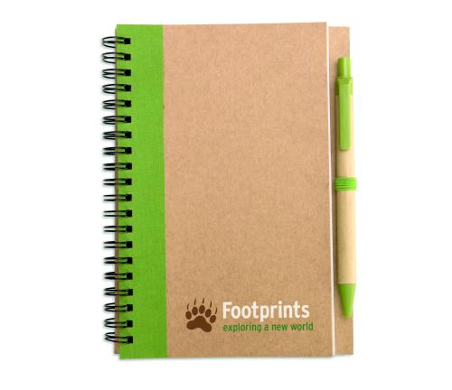 Recycled paper notebook with matching pen. Twin-wire. 140 plain recycled paper pages (70 sheets). Matching push button ball pen in recycled carton and biodegradable plastic. Blue ink. Matching elastic pen holder. FSC MIX CREDIT | P7.1 | FSC-C213206