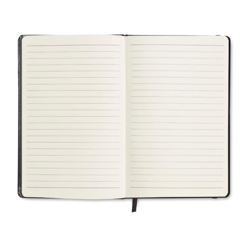 A5 notebook with hard PU cover. Casebound. 192 lined recycled paper pages (96 sheets). Matching elastic closure strap and ribbon page-marker. FSC®-certified | FSC MIX CREDIT, P7.1, FSC-C213206