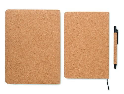 A5 cork portfolio. Refillable A5 notebook with hard cork cover. Casebound. 192 recycled paper lined pages (96 sheets). Matching pen and pen holder. 2 card holders and one large compartment. Elastic closure strap.