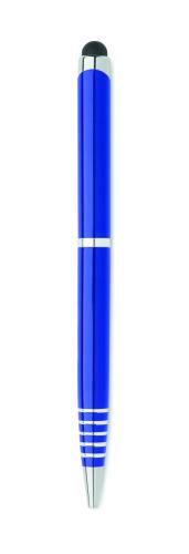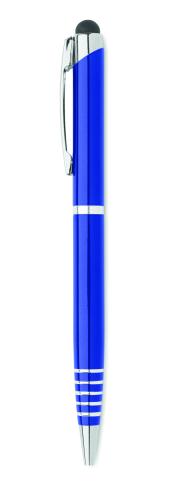 Twist action ball pen in recycled aluminium with stylus. Blue ink.