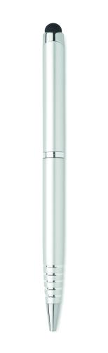 Twist action ball pen in recycled aluminium with stylus. Blue ink.