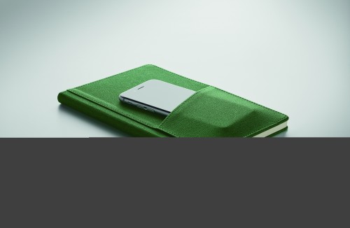A5 notebook with PU hard cover with front phone pocket. Case bound. 160 recycled paper lined pages (80 sheets). Matching ribbon bookmark. FSC®-certified | FSC MIX CREDIT, P7.1, FSC-C213206