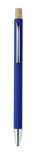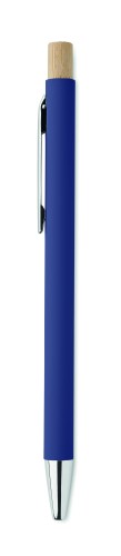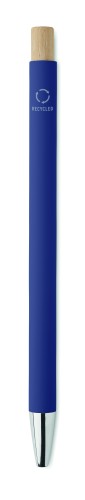 Recycled aluminium with bamboo push button. Silver tip and clip. Blue ink.