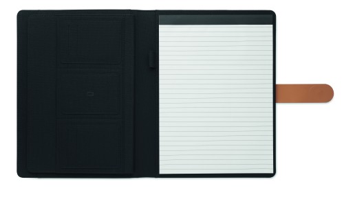 A4 portfolio in RPET with faux leather details. Replaceable A4 notepad.30 recycled paper lined pages. Pen holder. 4 cardholders, 3 small pockets and one big compartment. Magnetic strap closure. FSC®-certified | FSC MIX , P8.6, FSC-C213206