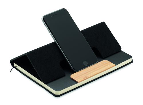 A5 RPET felt hard cover notebook set with phone stand functionality and push ball pen with bamboo barrel. Case bound. 160 recycled paper lined pages (80 sheets). Elastic closure strap. Ribbon bookmark. Blue ink.