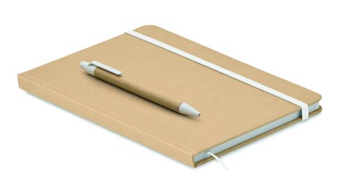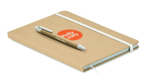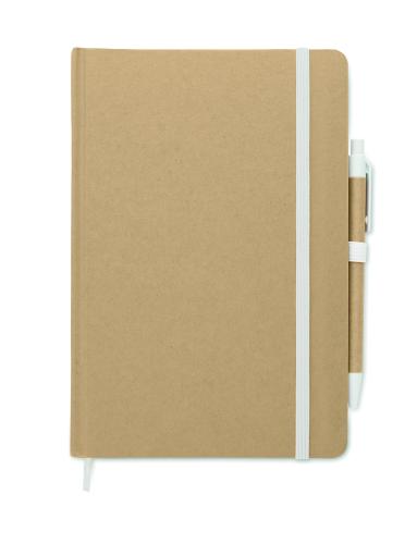 A5 notebook with hard recycled carton cover. Case bound. 160 lined pages (80 sheets recycled paper). Elastic closure strap and pen loop, ribbon bookmark. Includes push button ball pen with recycled paper barrel. Blue ink.