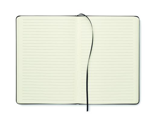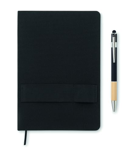 A5 notebook set with 600D RPET hard cover. Front elastic band phone holder function and front pen loop with push ball pen with bamboo grip detail. Case bound. 160 recycled paper lined pages (80 sheets). Includes envelope inside the back cover. Elastic closure strap. Ribbon bookmark. Blue ink. FSC®-certified | FSC MIX CREDIT, P7.1 , FSC-C213206