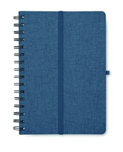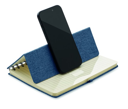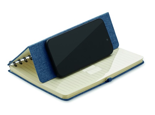 A5 notebook with 600D RPET hard cover with smartphone stand function. Twin-wire. 160 lined pages (80 sheets). 70 gsm recycled paper. Elastic closure strap.
