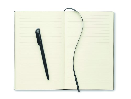 A5 notebook with structured PU cover with ABS twist ball pen inside spine pen holder. Case bound. 160 lined pages recycled paper (80 sheets).