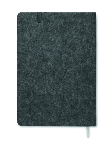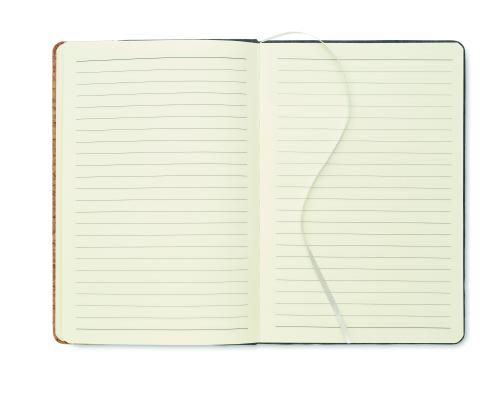 A5 notebook with RPET felt cover and cork. 160 recycled paper lined pages (80 sheets). Elasticated pen loop on front, matching elastic closure strap and ribbon page-marker. FSC®-certified | FSC MIX CREDIT, P7.1, FSC-C213206