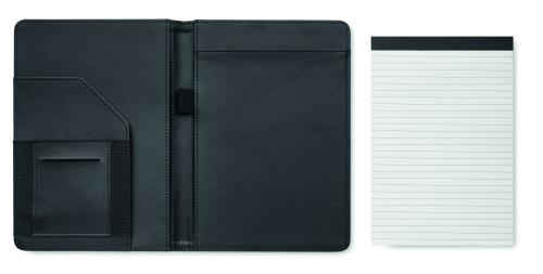 A5 portfolio in 2 tone 300D RPET. Replaceable A5 notepad. 40 white lined bamboo paper pages (20 sheets). Pen holder. Cardholders inner side and one big compartment.