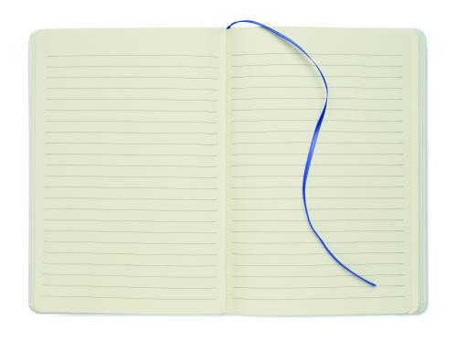 A5 notebook with hard cover made of 70% recycled milk carton pack and 30% recycled paper. White cover. Casebound. 160 lined recycled paper pages (80 sheets). Elastic closure strap, ribbon bookmark matching with revealed colour. After laser engraving the colour is revealed.
