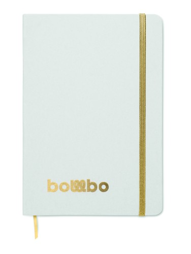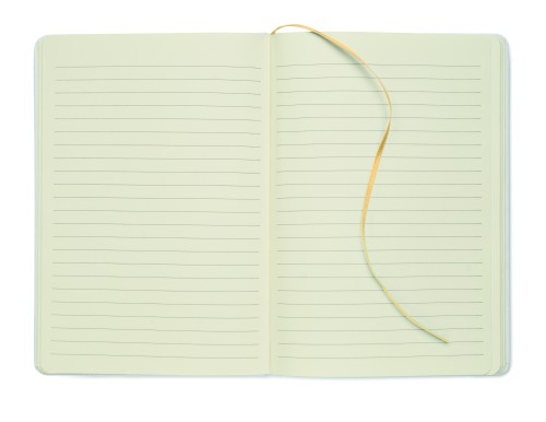 A5 notebook with hard cover made of 70% recycled milk carton pack and 30% recycled paper. White cover. Casebound. 160 lined recycled paper pages (80 sheets). Elastic closure strap, ribbon bookmark matching with revealed colour. After laser engraving the colour is revealed.