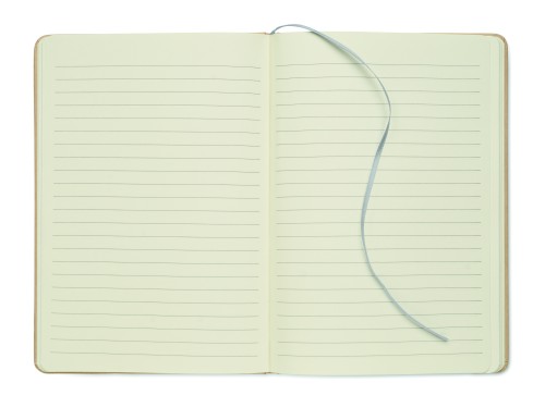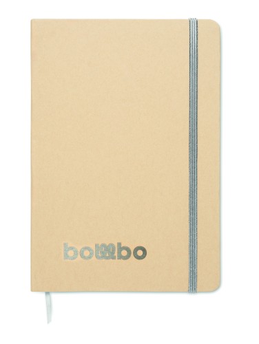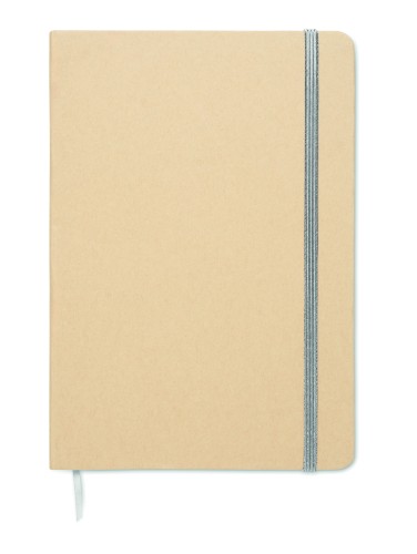 A5 notebook with hard recycled carton cover. Beige cover. Case bound. 160 lined recycled paper pages (80 sheets). Elastic closure strap, ribbon bookmark matching with revealed colour. After laser engraving the colour is revealed. FSC®-certified | FSC MIX CREDIT, P7.1, FSC-C213206
