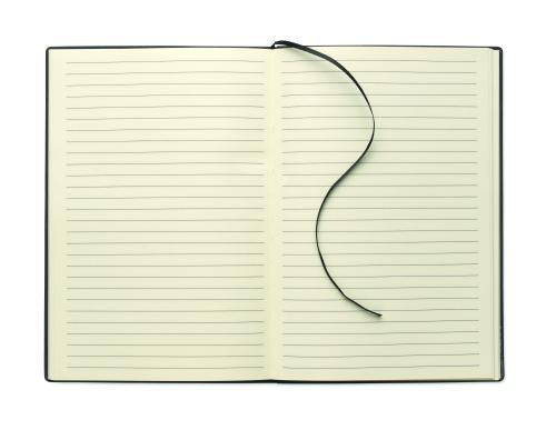 A5 PU notebook with soft cover. Casebound. 160 lined recycled paper pages (80 sheets). Matching elastic band and ribbon bookmark. Metal detail on the front.