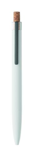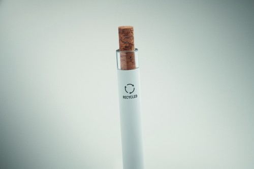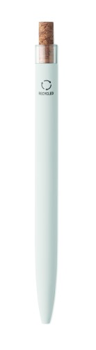 Push ball pen in recycled aluminium with cork detail button and metal clip. Blue ink.