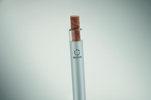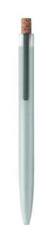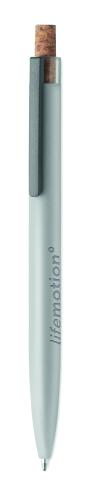 Push ball pen in recycled aluminium with cork detail button and metal clip. Blue ink.