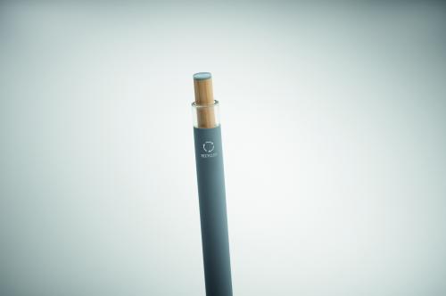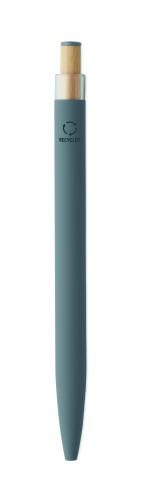 Recycled aluminium push ball pen with bamboo button with matching colour detail and matching metal clip. Blue ink.