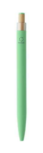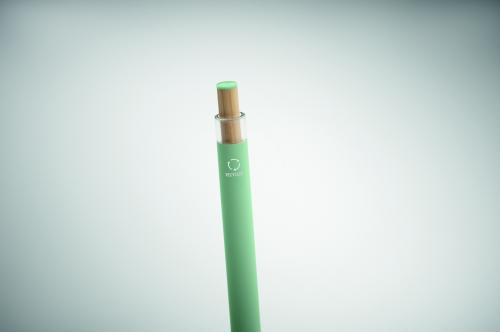 Recycled aluminium push ball pen with bamboo button with matching colour detail and matching metal clip. Blue ink.