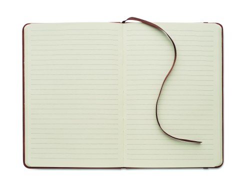 A5 notebook in 40% recycled post consumer smokey hard PU cover and 60% PU cover. Casebound. 160 lined pages, 70gsm recycled paper (80 sheets). Matching elastic closure strap and ribbon page marker.