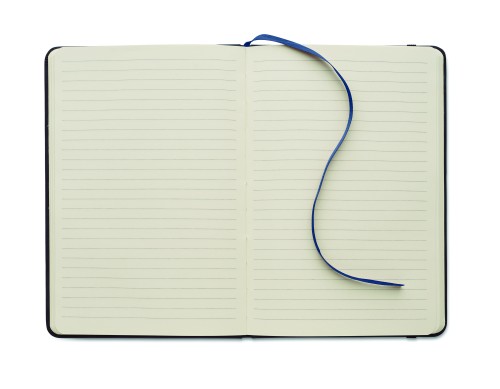 A5 notebook in 40% recycled post consumer smokey hard PU cover and 60% PU cover. Casebound. 160 lined pages, 70gsm recycled paper (80 sheets). Matching elastic closure strap and ribbon page marker.