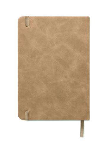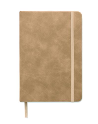A5 notebook in 40% recycled post consumer smokey hard PU cover and 60% PU cover. Casebound. 160 lined pages, 70gsm recycled paper (80 sheets). Matching elastic closure strap and ribbon page marker.