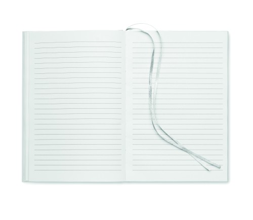 A5 journal notebook in 60% recycled post consumer polyester and 40% PU cover. Casebound. 256 lined pages in 70gsm recycled paper (128 sheets). With 2 polyester ribbon page markers.