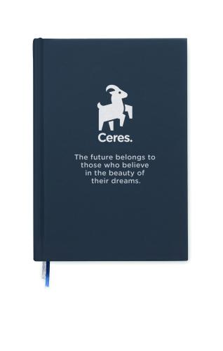 A5 journal notebook in 60% recycled post consumer polyester and 40% PU cover. Casebound. 256 lined pages in 70gsm recycled paper (128 sheets). With 2 polyester ribbon page markers.