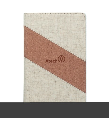 2 in 1 notebook. A5 notebook with integrated wireless charger 15W. Features cotton and cork details on cover, 128 lined paper (64 sheets). Ribbon bookmark.
