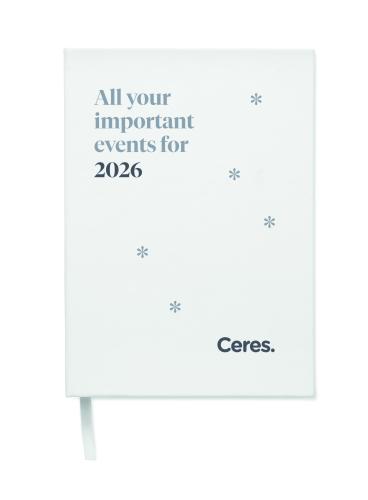 A5 daily diary notebook in 60% recycled post consumer polyester and 40% PU cover. 416 universal pages in 70gsm recycled paper (208 sheets). With matching colour polyester ribbon page marker.