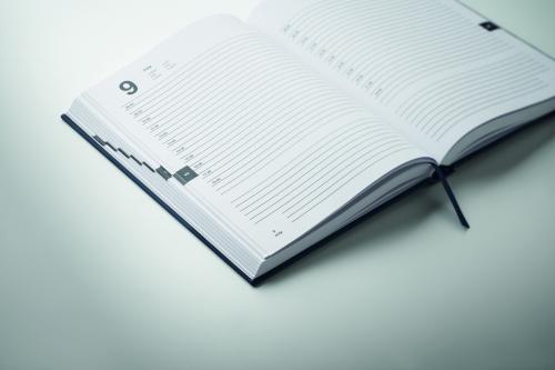 A5 daily diary notebook in 60% recycled post consumer polyester and 40% PU cover. 416 universal pages in 70gsm recycled paper (208 sheets). With matching colour polyester ribbon page marker.