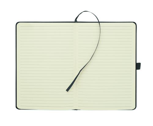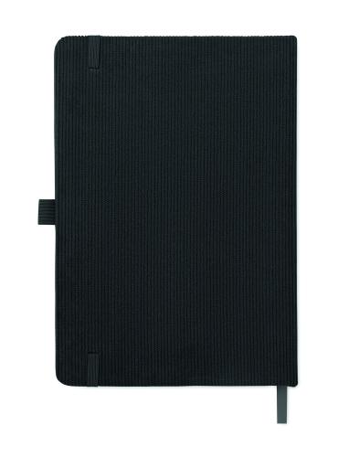 A5 notebook with hard RPET polyester corduroy cover and 192 lined recycled paper pages (70 gr/m2). Casebound design with elastic band closure, pen loop, ribbon page marker, and washed kraft paper tag.