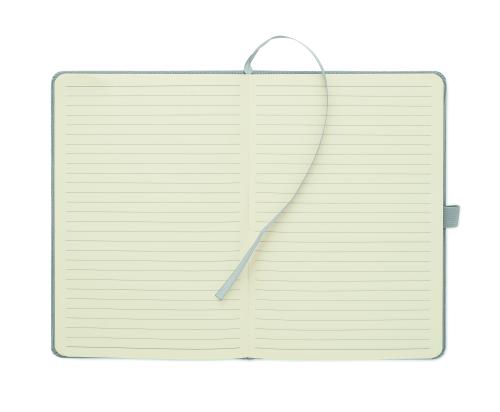 A5 notebook with hard RPET polyester corduroy cover and 192 lined recycled paper pages (70 gr/m2). Casebound design with elastic band closure, pen loop, ribbon page marker, and washed kraft paper tag.