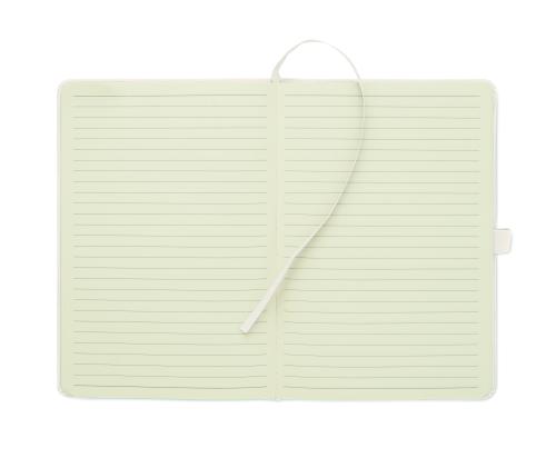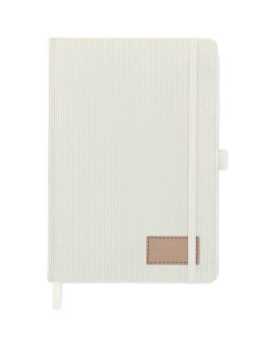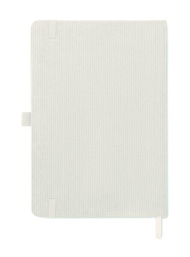 A5 notebook with hard RPET polyester corduroy cover and 192 lined recycled paper pages (70 gr/m2). Casebound design with elastic band closure, pen loop, ribbon page marker, and washed kraft paper tag.
