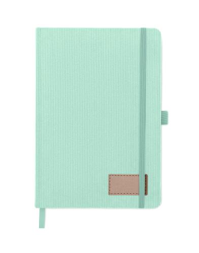 A5 notebook with hard RPET polyester corduroy cover and 192 lined recycled paper pages (70 gr/m2). Casebound design with elastic band closure, pen loop, ribbon page marker, and washed kraft paper tag.