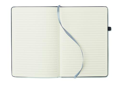 A5 notebook with 70% recycled pre-consumer leather and 30% latex PU cover. Casebound. 160 lined pages recycled paper (80 sheets). Matching elastic closure strap and pen holder.