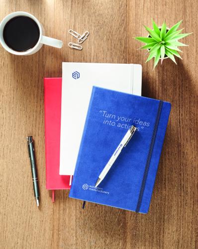 A5 notebook with hard PU cover. Casebound. 200 lined pages (100 sheets) in recycled paper (80 gsm). Matching elastic closure strap and ribbon page-marker. Made in EU.