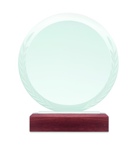 Round crystal award or memorial plaque on a beech wooden base in a gift box.