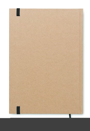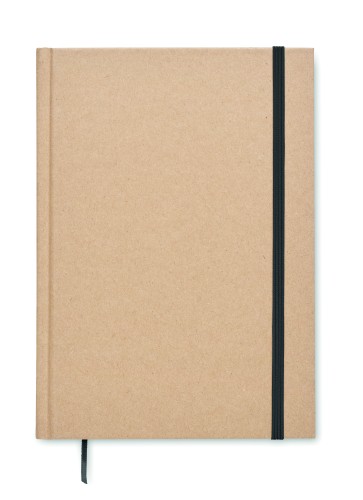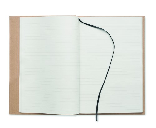 A5 notebook with hard recycled carton cover. Casebound. 200 lined recycled paper pages (100 sheets/80 gsm). Elastic closure strap and ribbon page-marker. Made in EU.