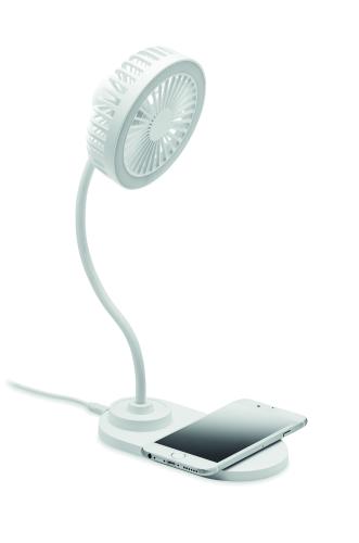 ABS Desktop fan with 3 speed settings with LED light (80 lumens) and 10W wireless charger. Output: DC 9V/1.1A (10W) for quick charging.