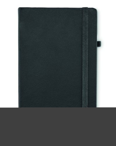 A5 notebook with 70% recycled pre-consumer leather and 30% latex PU cover. Casebound. 192 lined pages recycled paper (96 sheets). Matching cotton elastic closure strap and pen holder.