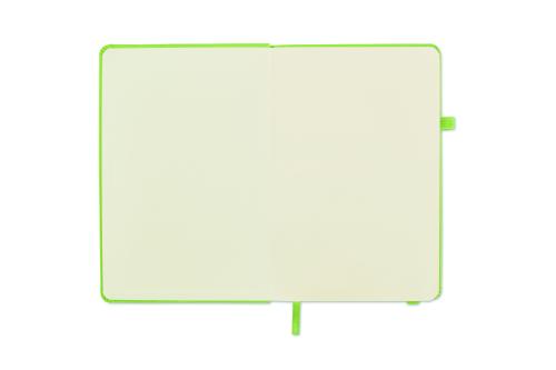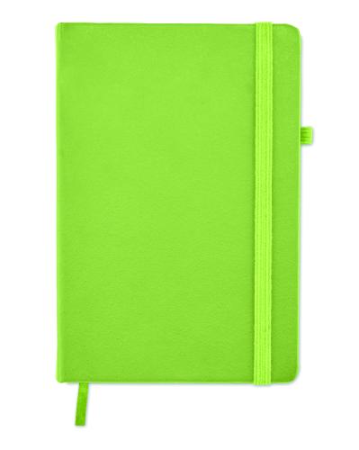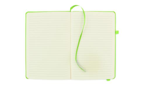 A5 notebook with 70% recycled pre-consumer leather and 30% latex PU cover. Casebound. 192 lined pages recycled paper (96 sheets). Matching cotton elastic closure strap and pen holder.