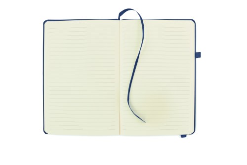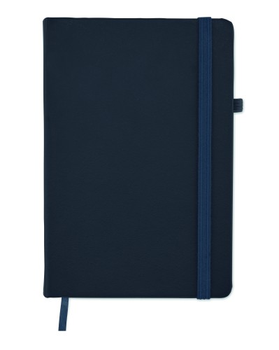 A5 notebook with 70% recycled pre-consumer leather and 30% latex PU cover. Casebound. 192 lined pages recycled paper (96 sheets). Matching cotton elastic closure strap and pen holder.