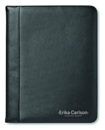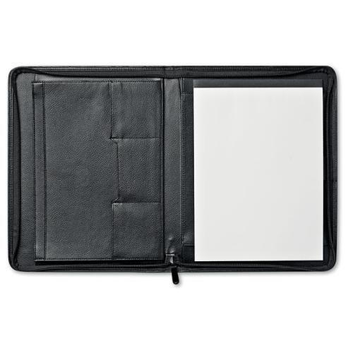A4 conference folder with bonded leather cover. Zipped. 25 plain sheets notepad. 4 inner compartments. Pen holder.