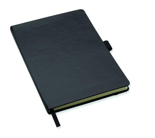 A5 notebook with pen. Hard PU cover. Casebound. 144 lined pages (72 sheets). Matching elastic closure strap, ribbon bookmark and pen holder. Matching metal push button ball pen. Blue ink. FSC MIX CREDIT | P7.1 | FSC-C213206
