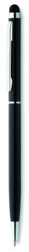 Twist action ball pen in recycled aluminium with stylus and shiny chrome clip. Blue ink.