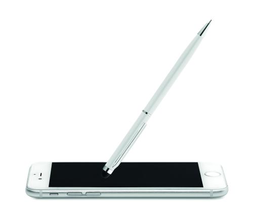 Twist action ball pen in recycled aluminium with stylus and shiny chrome clip. Blue ink.