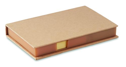Desk memo set with calendar. Large yellow recycled paper sticky memo notes. 5 assorted colour arrow index markers. 4 year calendar on the lid inner side.